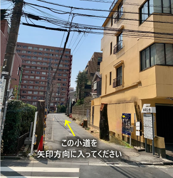 セブンイレブンを過ぎてすぐのところに、左に入る小道がありますのでそこを入ってください。ダイダイ色(オレンジ色)のマンション(柵の色はこげ茶)のすぐ手前にある小道です。(小道の入口には「婦選会館」の看板や矢印などがあります。ベルテ代々木IIへの矢印もあります。そのまま小道を入ってください)